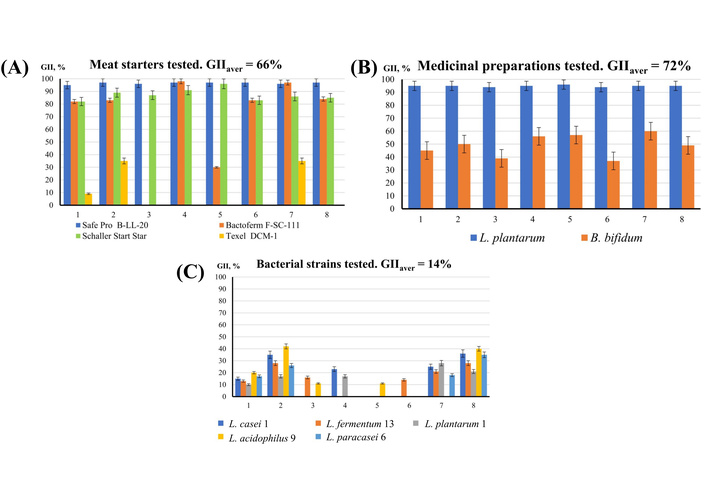 The antagonistic activity of the newly isolated strains, which averaged from 12 to 17, was significantly lower than that of most active meat starter cultures, excluding Texel DCM-1 (the average GII ranges from 70 to 97) and medicinal preparations Lactobacterin and Bifidobacterin (the average GII is 95 and 49, respectively).