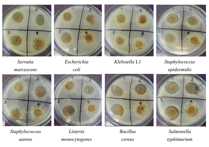 Bacterial opportunistic and pathogenic test-strains were provided by the Kazan Scientific Research Institute of Epidemiology and Microbiology (KNIIEM) of the Russian Federal Service for Supervision of Consumer Rights Protection and Human Welfare (Rospotrebnadzor): gram-positive bacteria Bacillus cereus, Staphylococcus epidermidis, Staphylococcus aureus, Listeria monocytogenes; gram-negative bacteria Serratia marcescens, Klebsiella L1, Escherichia coli, Salmonella typhimurium.