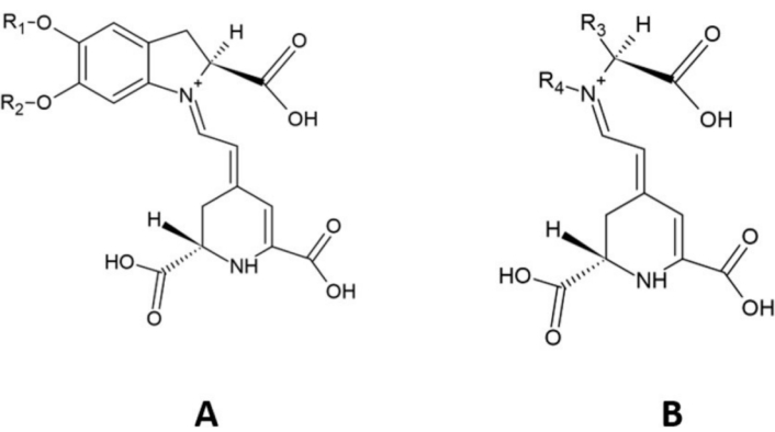 Structure of (A) betacyanin parent molecule and (B) betaxanthin parent molecule. R1 and R2: hydrogen or sugar moieties; R3 and R4: amino acids, amines, or their derivatives. Adapted from [13]. Copyright © 2023 Ornelas García, Guerrero Barrera, Avelar González, Chávez Vela and Gutiérrez Montiel. CC BY.