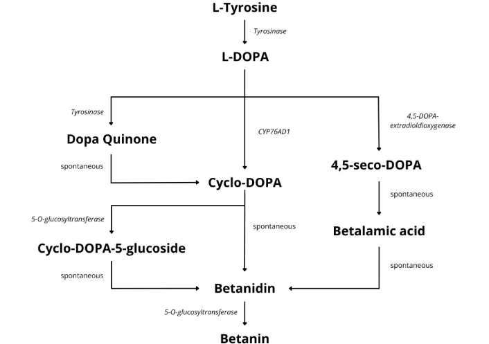 Apart from the tyrosinase enzyme, other enzymes are instrumental in the biosynthesis of betacyanins. These include 4,5-DOPA-extradiol-dioxygenase (DOD) and 5-O-glucosyl transferase (5GT) [57]. Their heterologous expression has been shown to lead to de novo production of betacyanin pigments in transgenic Eustoma plants [58]. DOD is a critical enzyme in this pathway. It catalyzes the formation of a betalamic acid, a structural intermediate for all betalains [59]. Researchers can make either beta-cyclins or betaxanthins using betalamic acid as a starting point [60]. The reaction begins with a tyrosine amino acid converted to L-DOPA by tyrosine hydroxylase. From DOPA, several pathways can branch off to give betanidin. In one pathway, DOD uses DOPA as a substrate for this reaction and cleaves it via an extradiol cleavage reaction, producing 4,5-seco-DOPA, which spontaneously undergoes a recyclization reaction, forming betalamic acid, which spontaneously becomes betanidin.