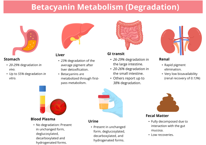 Bioavailability studies are important to measure the potential bioactive effects of phytocompounds in living subjects; this can be further translated into humans for health assessments and applications [140]. Currently, the mechanisms of how betacyanins are absorbed, metabolized, and excreted are yet to be fully described. Betacyanins begin to degrade immediately upon ingestion in the stomach. A study administering betacyanin solution into Wistar rat stomachs demonstrated that while continuous exposure to gastric secretions degrades these pigments, a portion is still absorbed directly through the gastric wall. The dose and exposure time significantly influence the rate of degradation and the intensity of absorption [141]. This is supported by earlier work calculating that 24–29% of betalain pigments are degraded in the stomach [142], a figure consistent with in vitro models showing a 21–35% loss in the gastric phase [143, 144].