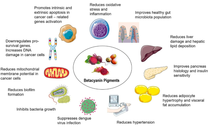 To enhance bioavailability, diversifying food sources, food processing, and food matrices could potentially increase betacyanin concentration and thus enhance absorption, overcoming the challenges of their limited absorption. Moreover, more studies should be done to increase the extraction of betacyanins from plant waste such as fruit peels. This will greatly reduce the environmental impact through food waste and generate income for growers. More rigorous clinical trials should be implemented soon to provide strong evidence-based information for clinical practice. Considering the current information available in the literature, existing evidence is pointing towards the application of betacyanins as a promising natural food pigment having multiple health benefits, acting through various biological mechanisms, including their interactions with the gut microbiome and binding of key cellular components.