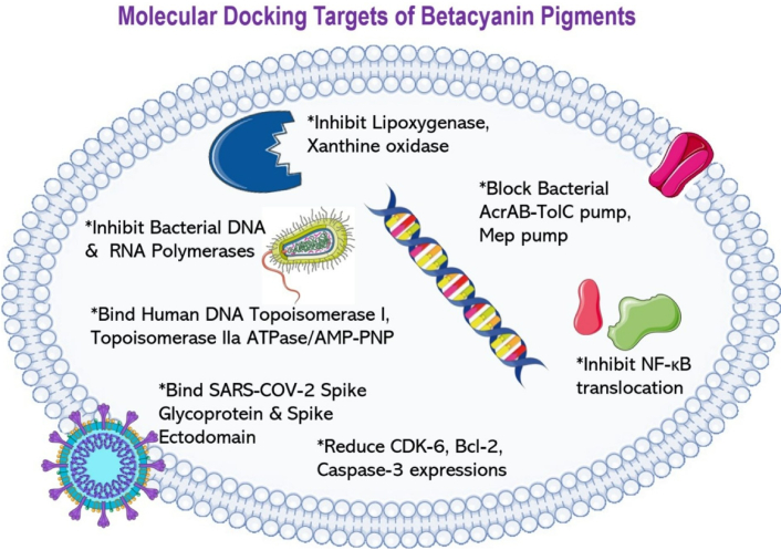 The molecular docking targets of betacyanin pigments on enzymes and/or proteins involved in various cellular pathways. Betacyanins demonstrated inhibitory activities in LOX, xanthine oxidase, in bacterial DNA and RNA polymerases, in human DNA topoisomerase I and IIa, in NF-κB protein, in genes involved in cell cycle and apoptosis, and in SARS-CoV-2 virus spike protein and receptor binding domain. These observations likely explain the molecular aspects of betacyanins’ activities observed in biological studies. LOX: lipoxygenase; NF-κB: nuclear factor-kappa B.