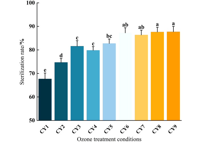 Sterilization rate of different ozone treatment conditions on boneless chicken claws. Different lowercase letters indicate significant differences (p < 0.05) among the treatment groups (CY1–CY9). Repeated superscript letters indicate that the means were not significantly different (p > 0.05). CY is the ozone water sterilization treatment group.