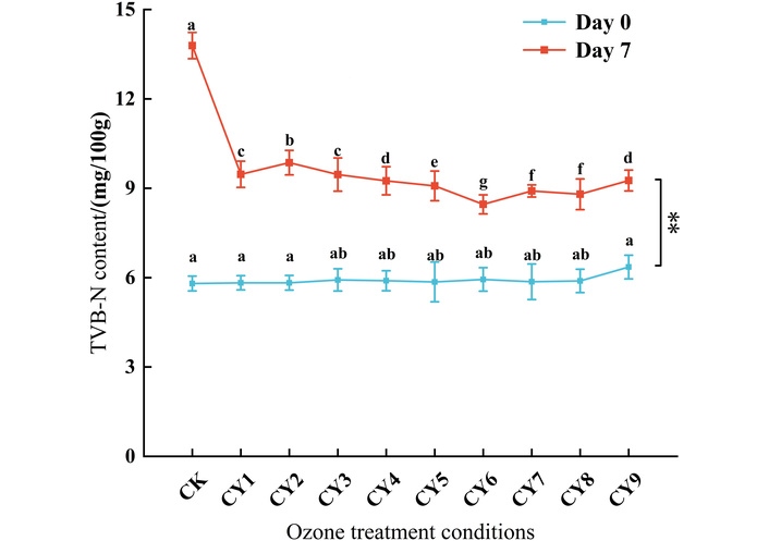 Effects of ozone water with different processes on TVB-N content in boneless chicken claw. Different lowercase letters (e.g., a, b, c, d, e, f) indicate statistically significant differences (p < 0.05) among different treatment groups at various time points (day 0 and day 7). ** indicates that there is a highly significant difference between day 0 and day 7 (p < 0.01). Repeated superscript letters indicate that the means were not significantly different (p > 0.05).
