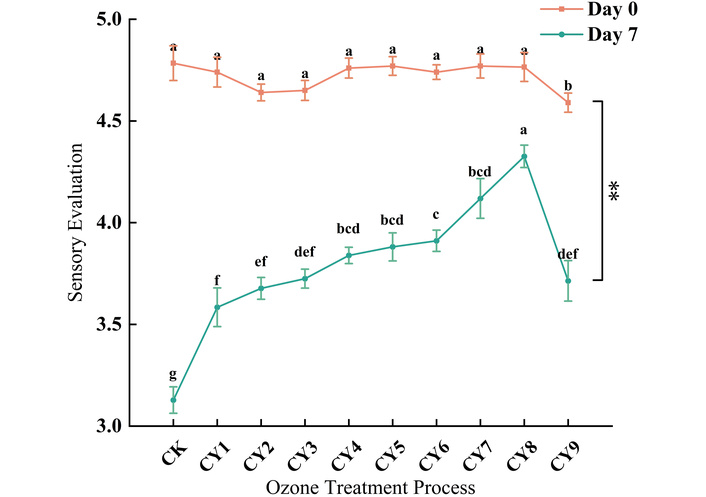 Effects of different process ozone water on the sensory quality of boneless chicken claw. Different lowercase letters (e.g., a, b, c, d, e, f) indicate statistically significant differences (p < 0.05) among different treatment groups at various time points (day 0 and day 7). ** indicates that there is a highly significant difference between day 0 and day 7 (p < 0.01). Repeated superscript letters indicate that the means were not significantly different (p > 0.05).