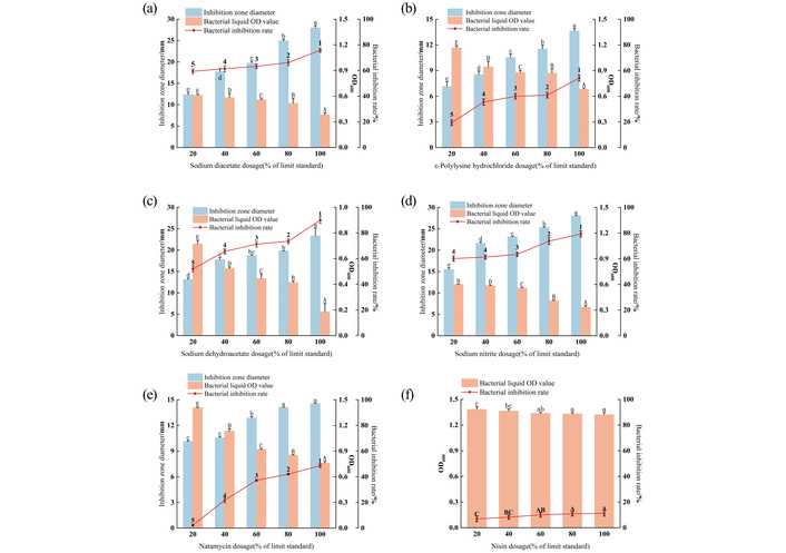 The antibacterial effect of a single preservative. (a) Antibacterial effect of sodium diacetate; (b) antibacterial effect of ε-polylysine hydrochloride; (c) antibacterial effect of sodium dehydroacetate; (d) antibacterial effect of sodium nitrite; (e) antibacterial effect of natamycin; (f) antibacterial effect of nisin.
