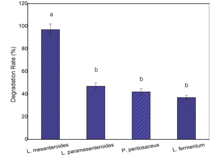 Degradation rate (%) of chlorpyrifos by LAB strains after 24 h of incubation at 35°C. Different letters above the bars indicate a significant difference (P < 0.05). LAB: lactic acid bacteria.