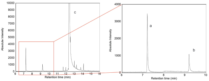 GC-MS chromatogram of chlorpyrifos degraded by LAB. Peak a (RT = 7.2 min) = 3,5,6 trichloro-2-pyridinol (TCP). Peak b (RT = 9.2 min) = diethyl thiophosphate (DETP). Peak c (RT = 12.35 min) = chlorpyrifos. GC-MS: gas chromatography-mass spectrometry; LAB: lactic acid bacteria; RT: retention time.