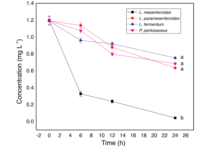 Degradation kinetics followed a first-order model in all strains (Figure 3, Table 1). The degradation rate constants for L. paramesenteroides, L. fermentum, and P. pentosaceus were comparable to those reported for other LAB strains [18]. Zhang et al. [18] (2014) found similar values for L. plantarum and S. thermophilus in milk, which showed degradation constants of 0.0186 and 0.0197 h–1 and degradation rates of 64 and 70%, respectively. In contrast, L. mesenteroides exhibited the highest rate constant and degradation efficiency, reaching 75% degradation after only 6 h of incubation.