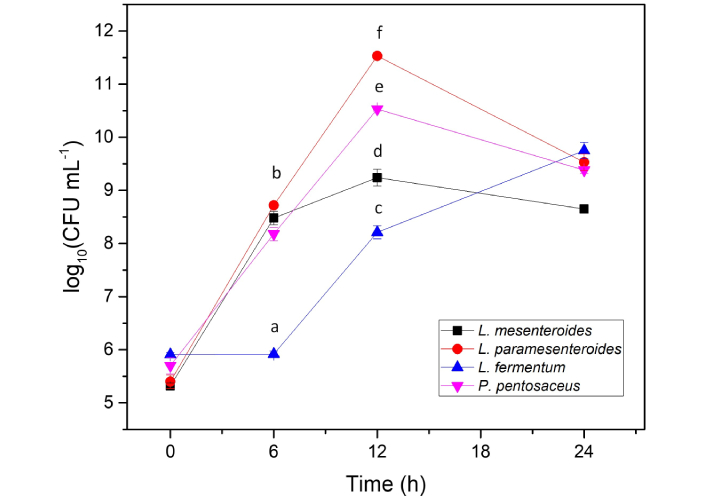 | L. paramesenteroides | 47 ± 3b | 0.0279b | 0.2130 ± 0.0053b |