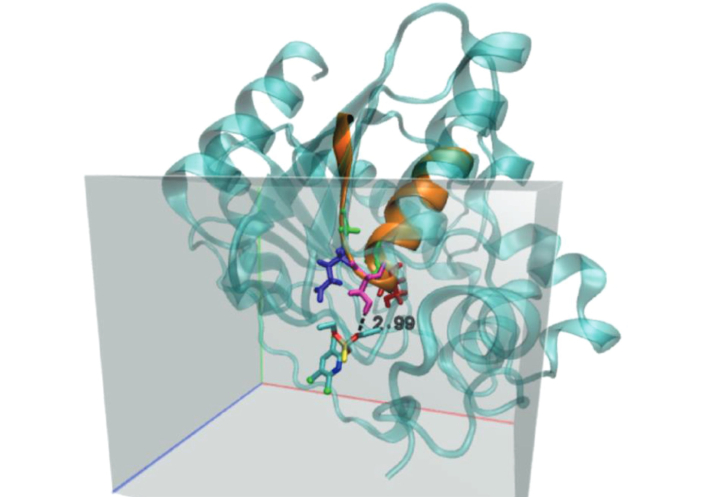 Table 3 summarizes the pocket parameters, binding energies, and inhibition constants. Pockets 1 and 3 showed similar free energies (ΔG ≈ –5.77 to –5.79 kcal mol–1), but pocket 1 contained a canonical hydrolase motif (Gly127-Glu128-Ser129-Ser130-Gly131), suggesting that catalysis likely occurs there. Hydrogen bonding also contributes to ligand stability [37, 38]. Figure 5 shows the loop (in orange) containing the Gly-Glu-Ser-Ser-Gly motif, where the dotted line represents the hydrogen-bond distance between the hydrogen of Ser129 and the oxygen of the thiophosphate group (2.99 Å). Pocket 3 may represent an allosteric site.