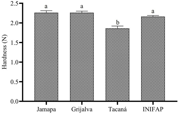 Evaluation of cooking time and hardness in P. vulgaris beans grown on stony soils revealed statistically significant differences (p < 0.05) among varieties. Among the cultivars evaluated, Grijalva had the longest cooking time, followed by INIFAP and Jamapa, while Tacaná had the shortest cooking time with 25.3 min (Figure 1). Grijalva, Jamapa, and INIFAP varieties recorded the highest hardness values with ~2.26 N, while Tacaná presented the lowest (Figure 2).