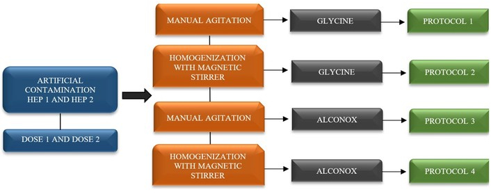 After this, 25 mL of HEP 1 and 2 were measured and transferred to a first-use plastic bag or to a beaker. Then, 175 mL of 1 M glycine, pH 5.5 or 0.1% Alconox was added. Both inocula were vortexed, and 10 μL of each dose of egg suspension was added at various points of HEP. The contaminated sample in the plastic bag was homogenized using smooth, pendulum-like manual agitation for 3 minutes, while the contaminated sample in the beaker was homogenized using a magnetic stirrer for 10 minutes.