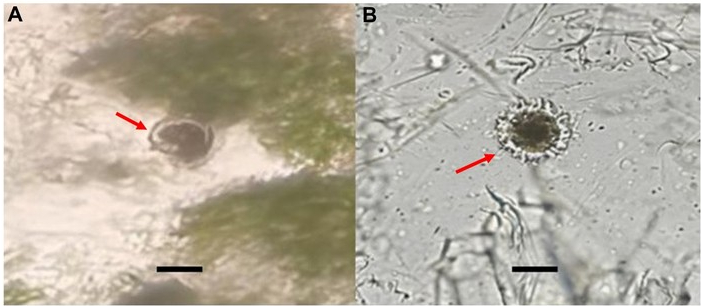 Recovery of A. suum eggs from home enteral preparation 1 (HEP 1) using distinct dissociation solutions. (A) A. suum egg (red arrow), visualized at 40× magnification in HEP 1 (1 M glycine, pH 5.5). (B) A. suum egg (red arrow), visualized at 40× magnification in HEP 1 (0.1% Alconox). Scale: 50 μm.