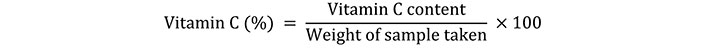 The vitamin C of the beverage samples was measured using a simple redox titration method using iodine solution as reported by Lee [19]. In this 0.02 mol/L of potassium iodide was made and 2.6 g iodine was added making it to the desired value using distilled water and starch solution was also made using 0.25 g of starch and adding it to 50 mL boiling water and using it when it is cooled. The vitamin C content of the beverage samples were calculated as Eqn. 1 and Eqn. 2: