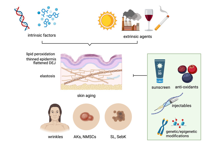 Overview of the key intrinsic and extrinsic factors driving skin aging, the underlying cellular and histological mechanisms, clinical manifestations, and potential preventive strategies. AKs: actinic keratoses. DEJ: dermoepidermal junction. NMSC: non-melanoma skin cancer. SebK: seborrheic keratosis. SL: solar lentigo. Created in BioRender. Paganelli, A. (2025) https://BioRender.com/8jgpgym.