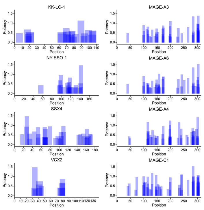 Predicted potency of CD8+ cytotoxic T cell activation by HLA class I—presented epitopes derived from eight tumor-specific antigens in a patient with SRCC. The VERDI diagnostic test was used to predict the patient-specific immunogenic epitope repertoire shown in the figure. Blue bars represent the positions of predicted epitopes along the amino acid sequences of the indicated antigens. Darker shading indicates overlapping epitopes, suggesting clusters of immunogenic regions within the antigen sequences. KK-LC-1: Kita-Kyushu lung cancer antigen-1; MAGE-A3: melanoma antigen family A3; NY-ESO-1: New York esophageal squamous cell carcinoma 1; SSX4: synovial sarcoma, X breakpoint 4; VCX2: variable charge, X-linked 2.