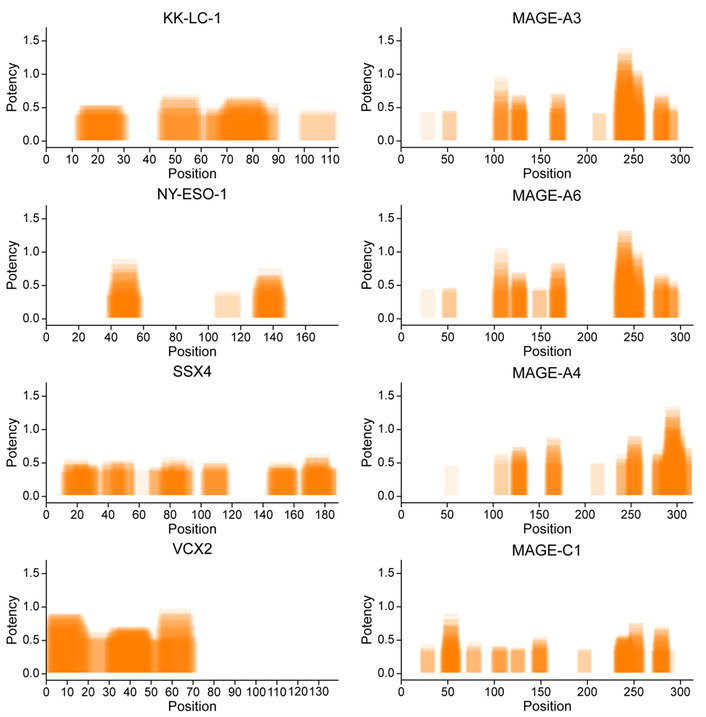 Predicted potency of CD4+ helper T cell activation by HLA class II—presented epitopes derived from eight tumor-specific antigens in a patient with SRCC. The VERDI diagnostic test was used to predict the patient-specific immunogenic epitope repertoire. Orange bars represent the positions of top-ranked predicted epitopes along the amino acid sequences of the indicated antigens. Darker shading indicates overlapping epitopes, suggesting clusters of immunogenic regions within the antigen sequences. KK-LC-1: Kita-Kyushu lung cancer antigen-1; MAGE-A3: melanoma antigen family A3; NY-ESO-1: New York esophageal squamous cell carcinoma 1; SSX4: synovial sarcoma, X breakpoint 4; VCX2: variable charge, X-linked 2.