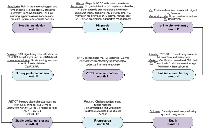 The clinical timeline of disease course and treatment is summarized in Figure 3. In detail, the patient was diagnosed with stage IV gastric SRCC and initiated first-line chemotherapy with a folinic acid, fluorouracil, oxaliplatin modified regimen 6 (FOLFOX6m), consistent with standard clinical guidelines [12]. After four cycles, disease progression was documented with worsening omental and mesenteric carcinomatosis and an elevation of CA 19-9 levels to 4,390 U/mL. According to current clinical recommendations, second-line chemotherapy with paclitaxel plus ramucirumab was initiated [13].