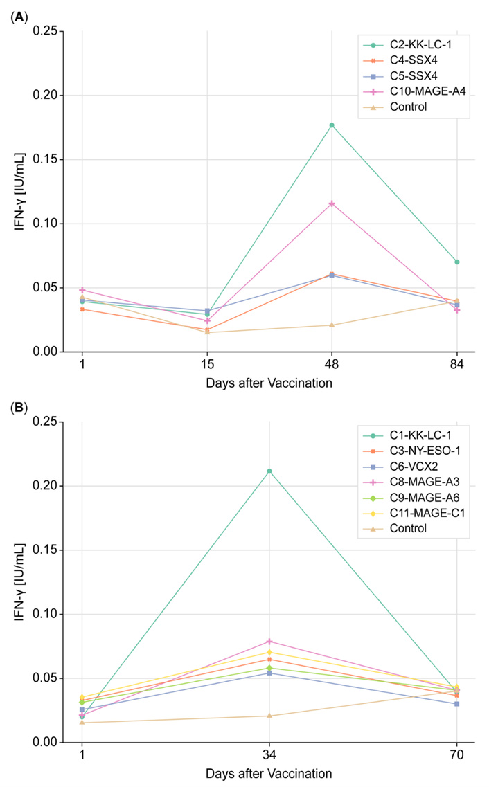 Tumor-specific T cell responses in the SRCC patient pre- and post-VERDI vaccine treatment. (A) Four vaccines targeting KK-LC-1, SSX4, and MAGE-A4 were administered 10 days (labeled as day 1) after paclitaxel and ramucirumab treatment. (B) Six vaccines targeting KK-LC-1, NY-ESO-1, VCX-2, MAGE-A3, MAGE-A6, and MAGE-C1 were given 24 days (labeled as day 1) after paclitaxel and ramucirumab. The subsequent paclitaxel and ramucirumab treatment was delayed by 24 days. KK-LC-1: Kita-Kyushu lung cancer antigen-1; MAGE-A3: melanoma antigen family A3; NY-ESO-1: New York esophageal squamous cell carcinoma 1; SRCC: signet ring cell carcinoma; VCX2: variable charge, X-linked 2; VERDI: Vaccine Epitopes Ranked by Digital Intelligence.