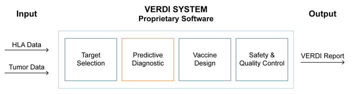 To address these challenges, we developed the VERDI (Vaccine Epitopes Ranked by Digital Intelligence) System—a cloud-based computational pipeline that uses patient-specific HLA class I and II genotypes to select peptides from known tumor-associated antigens (TAAs), such as cancer-testis antigens (CTAs), that are predicted to elicit strong CD4+ and CD8+ T cell responses. Unlike neoantigen vaccines, VERDI does not rely on tumor mutations. Instead, it leverages shared antigens with known tumor specificity, while filtering out epitopes with expression in healthy tissues to reduce the risk of immune-related adverse events (irAEs). At the core of the VERDI System is a clinically validated diagnostic module (the VERDI test) that enables prediction of peptide immunogenicity at the individual level.