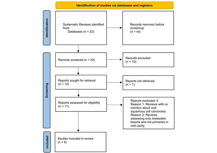 Systematic reviews focusing on the role of the PD-L1 pathway in OSCC were included. Only peer-reviewed journal publications were considered, with no restrictions on publication date or language.