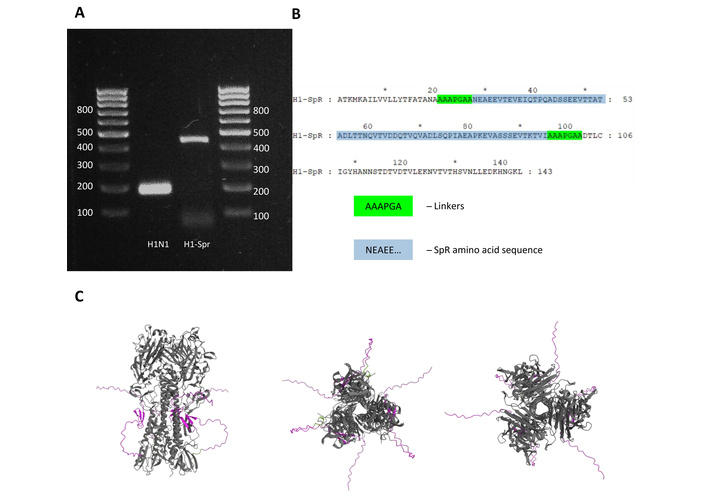 Molecular characterization of H1-Spr. (A) Agarose electrophoresis of the HA-insert PCR product. (B) Amino-acid sequence of the Spr1875 insert (linker indicated). (C) AlphaFold3 model (side/bottom/top views). Flexible linker = green; Spr1875 insert = pink; HA = grey. Model metrics: ipTM = 0.84, pTM = 0.85; final RMSD vs. reference HA = 0.206 Å. No clear furin-like cleavage motifs were identified in the insert.