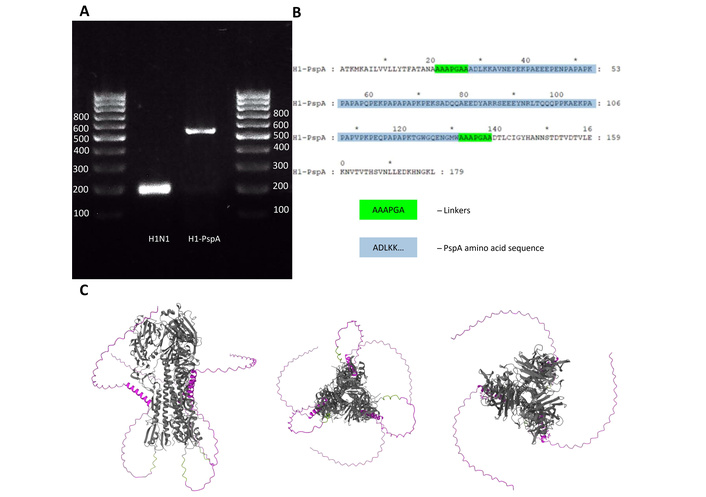 Molecular characterization of H1-PspA. (A) Agarose electrophoresis of the HA + PspA PCR product. (B) Amino-acid sequence of the PspA insert (linker annotated). (C) AlphaFold3 model (side/bottom/top views). Flexible linker = green; PspA insert = pink; HA = grey. Model metrics: ipTM = 0.81, pTM = 0.80; final RMSD = 0.283 Å (note: Early alignment cycles rejected ~267 atoms, indicating local conformational distortions). The insert is predicted to be highly disordered and contains potential processing motifs.