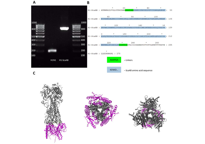 Molecular characterization of H1-ScaAB. (A) Agarose electrophoresis of the HA + ScaAB PCR product. (B) Amino-acid sequence of the ScaAB insert (linker marked). (C) AlphaFold3 model (side/bottom/top views). Flexible linker = green; ScaAB insert = pink; HA = grey. Model metrics: ipTM = 0.73, pTM = 0.72; reported RMSD ≈ 18.08 Å with an alignment warning, consistent with extensive local and global rearrangements induced by the extended insertion. Putative dibasic/furin-like motifs were identified at positions 81–85, 136–140, and 154–156.