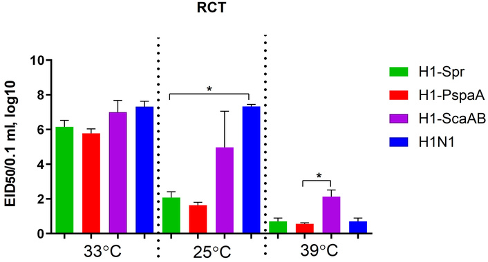 All viruses exhibited the ts+ phenotype, confirming temperature sensitivity consistent with the requirements for live attenuated vaccines. The H1N1 vaccine strain displayed ts–/ca– phenotypes—it did not replicate at 39°C but retained active replication at 25°C (Figure 4). In contrast, the H1-Spr and H1-PspA strains showed markedly reduced replication at 25°C relative to 33°C, indicating the absence of cold adaptation while maintaining temperature sensitivity. The H1-ScaAB virus, however, exhibited a ca+ phenotype and replicated more efficiently than the other recombinant candidates at elevated temperature (Kruskal–Wallis test, p = 0.004).