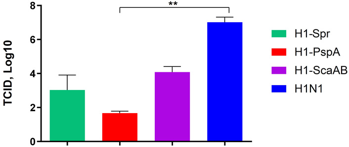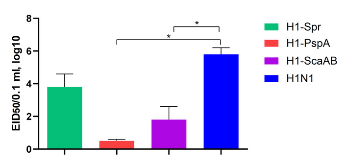 The growth characteristics of the recombinant vector vaccines were analyzed in MDCK cell culture under optimal incubation conditions (33°C) for cold-adapted viruses (Figure 5). Replication of the H1-PspA virus was significantly reduced compared with the parental H1N1 strain, whereas H1-Spr and H1-ScaAB showed slightly lower replication levels, though the differences were not statistically significant.
