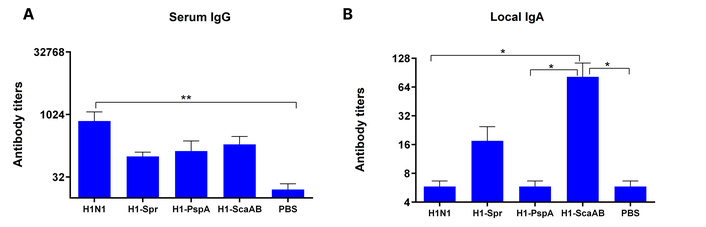 The unmodified H1N1 vaccine strain replicated efficiently in chicken embryos, MDCK cells, and mouse respiratory tissues, and induced a robust systemic immune response to influenza virus. The H1-ScaAB candidate also showed high replication efficiency in chicken embryos and induced a local antibody response to influenza virus. In contrast, the recombinant strains H1-Spr and H1-PspA exhibited lower replication in chicken embryos, MDCK cells, and mouse lungs, resulting in a comparatively weaker immune response to influenza virus. However, these constructs elicited the most pronounced local and systemic antibody responses to the pneumococcal Psp peptide, respectively.