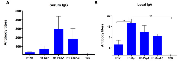 No statistically significant increase in local IgA was detected following immunization with the other recombinant candidates. However, the highest average serum antibody level to the recombinant pneumococcal peptide was observed in the H1-PspA group (Figure 8A). In addition, the H1-Spr candidate induced a statistically significant increase in antibodies specific to the recombinant pneumococcal peptide Psp (Figure 8B).
