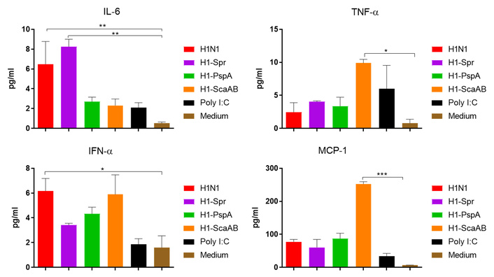 Exposure to the unmodified H1N1 strain resulted in the highest IFN-α production, IL-6 levels were elevated following exposure to H1N1 and H1-Spr, while MCP-1 concentrations were highest after H1-ScaAB exposure. Given the limited number of independent experiments, these observations are preliminary and require confirmation in additional biological replicates and more physiologically relevant models.