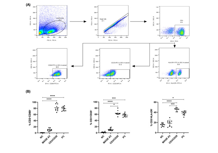 PBMCs (1.5 × 106 per well) were stimulated with PepTivator® MAGE-A3 (premium grade, human; stock 30 nmol/mL; Cat. No. 130-095-384; Miltenyi Biotec, Germany) at 1 nmol of each peptide per mL, per manufacturerʼs instructions for peptide-pool restimulation for 24 h. For 15-mer peptides, this corresponds to ≈ 1.67 μg/mL per peptide. Because PepTivator® products are peptide pools, mass/volume is reported per peptide; the aggregate pool mass depends on peptide count. Activation markers were assessed at 6 h (CD69), 18 h (CD25), and 24 h (HLA-DR: human leukocyte antigen-DR isotype) post-stimulation.