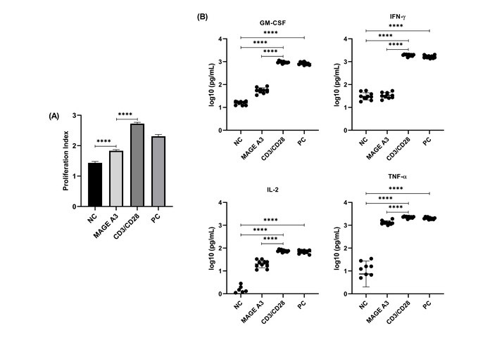 Proliferation index (PI) and cytokine secretion in PBMCs following MAGE-A3 stimulation. (A) PI (CFSE) across conditions. Data are mean ± SD with individual donors (n = 10). (B) Cytokines at 24 h (MACSPlex). All panels use log10 axes with common lower bound = 0.1 pg/mL; points = donors, bars = mean ± SD (n = 10). Statistics: Friedman + Dunn for endpoints with any non-normal group; otherwise RM-ANOVA + Šídák. Exact adjusted P values are in Table S3; asterisks on plots denote multiplicity-adjusted comparisons shown (****P < 0.0001). CFSE: carboxyfluorescein succinimidyl ester; GM-CSF: granulocyte-macrophage colony-stimulating factor; IFN-γ: interferon-gamma; IL-2: interleukin-2; MAGE-A3: melanoma-associated antigen-A3; NC: negative control; PC: positive control; TNF-α: tumor necrosis factor-alpha.
