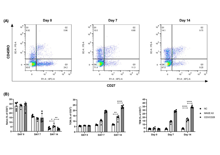 Memory T cell kinetics over 14 days following MAGE-A3 stimulation. (A) Representative CD45RO/CD27 density plots (FlowJo). Default quadrant overlays are shown; the lower-left double-negative quadrant is displayed for context but was not analyzed. (B) Memory subset composition (% of CD3+) at Day 0/7/14. Points = donors; mean ± SD. *P < 0.05; **P < 0.01; ****P < 0.0001. Statistics: two-way RM-ANOVA (condition × time) with Šídák simple effects; for clarity, only Day 14 pairwise results are annotated on the plots, with full Day 0/7 in Table S3. See Figure S2 for line-plot trajectories (mean ± SEM) of Naïve, TCM, and TEM over time. MAGE-A3: melanoma-associated antigen-A3; NC: negative control; TCM: central memory T cell; TEM: effector memory T cell.