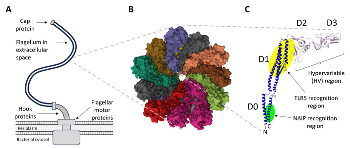Overview of structural properties of the bacterial flagellum and flagellin monomers. (A) The flagellum, which comprises up to 30,000 flagellin monomers, is typically attached to the flagellar motor proteins via a curved hook structure and bound by a terminal cap protein. (B) A cross-sectional view of the E. coli K12 flagellum, looking down the central channel (RCSB: 8CXM). (C) Structural features of a typical flagellin monomer, showing the locations of the highly conserved D0 and D1 domains, and the variable D2 and D3 domains. The regions responsible for recognition by TLR5 and NAIP/NLRC4 are shown in yellow and green highlight, respectively. For S. Typhimurium FljB, the N-terminal TLR5 recognition domain maps to positions 80–118 (GALNEINNNLQRVRELAVQSANSTNSQSDLDSIQAEITQ), the C-terminal TLR5 recognition domain maps to positions 420–451 (LQKIDAALAQVDALRSDLGAVQNRFNSAITNL), and the C-terminal NAIP/NLRC4 recognition domain maps to the final 35 amino acids of the protein (TEVSNMSRAQILQQAGTSVLAQANQVPQNVLSLLR). Those residues contributing most to receptor activation, as determined by alanine scanning, are shown in bold [11–13]. Example structure shown is S. Typhimurium FliC (RCSB: 1UCU). NAIP: nucleotide-binding and oligomerization domain-like receptor family apoptosis inhibitory protein; NLRC4: NLR family caspase recruitment domain (CARD) domain-containing protein 4; TLR: Toll-like receptor.