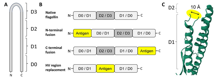 Topologies of commonly studied flagellin fusion proteins. (A) Cartoon indicating the locations of the D0–D3 domains with respect to the primary sequence and “hairpin” structure of flagellin. (B) Cartoon summarising the topologies of commonly studied flagellin fusion proteins in comparison to native flagellin. (C) The distance between the two ends of the “neck” preceding the hypervariable region, i.e., at the interface between D1 and D2, is approximately 10 Å. Insertion of antigens into this region may require the use of flexible, non-immunogenic linker sequences. Structure shown is S. Typhimurium FljB (RCSB: 1UCU). HV: hypervariable.