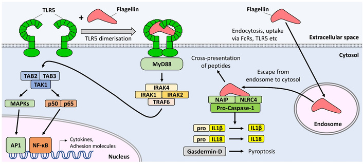 Recognition of flagellin by receptors of the innate immune system. Extracellular flagellin is detected by TLR5 in the plasma membrane, resulting in increased expression of cytokines and adhesion molecules via activation of NF-κB and AP1 transcription factors. Cytosolic flagellin is detected by the NAIP/NLRC4 complex, resulting in cleavage of pro-IL1β, pro-IL18, and gasdermin-D, which may in turn promote pyroptosis. AP1: activator protein 1; IL: Interleukin; IRAK: interleukin-1 receptor-associated kinase; MAPK: mitogen-associated protein kinase; MyD88: myeloid differentiation factor 88; NAIP: NOD-like receptor family apoptosis inhibitory protein; NF-κB: nuclear factor kappa B; NLRC4: NLR family caspase recruitment domain (CARD) domain-containing protein 4; TAB: TAK1-binding protein; TAK1: transforming growth factor-β-activated kinase 1; TLR5: Toll-like Receptor 5; TRAF6: tumour necrosis factor receptor-associated factor 6.