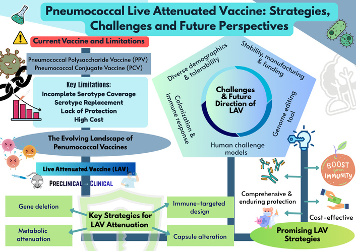 The past two decades have firmly established the tantalizing promise of pneumococcal LAVs as a promising strategy to address the limitations of current vaccine options, offering the potential for improved efficacy and cost-effectiveness. Advances in attenuation methodologies, the identification of promising knockout mutants, and refined techniques for introducing multiple genetic modifications have significantly strengthened the scientific foundation for LAV development. Importantly, foundational preclinical work, now complemented by emerging clinical trial data, offers critical insights into the safety and efficacy of LAVs, signalling considerable progress in overcoming challenges related to attenuation safety, manufacturing, and the induction of broad immune protection. Despite this promising trajectory, significant challenges persist that must be actively addressed to ensure feasibility and scalability. These include optimizing manufacturing processes, securing sustainable funding, and refining predictive models of the immune response to guarantee consistent protection. On a primary impact level, ensuring robust safety across diverse populations and achieving durable, population-wide protection remain the pivotal hurdles that will ultimately determine the success of LAVs. The final realization of pneumococcal LAVs will depend on a collaborative and integrated effort among researchers, clinicians, industry partners, and key global health stakeholders. By overcoming these obstacles, LAVs are poised to play a crucial role in reducing the global burden of pneumococcal disease, providing effective and affordable protection, particularly in low-resource settings where current vaccine strategies are often insufficient.