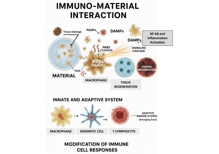 Conceptual schematic of the immuno-material interface. The interaction begins with the adsorption of proteins and the release of damage-associated molecular patterns (DAMPs) from damaged tissue and cell stress. These signals, along with potential pathogen-associated molecular patterns (PAMPs), are recognized by pattern recognition receptors (PRRs) such as toll-like receptors (TLRs) on innate cells (macrophages, dendritic cells). This triggers a signaling cascade leading to either tissue regeneration or chronic inflammation [foreign body response (FBR)]. The involvement of the adaptive system (T-lymphocytes) is highlighted as an emerging area of research in biomaterial science.