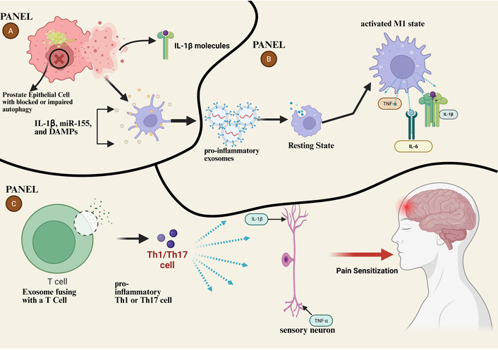 Hypothetical model of the autophagy-exosome axis in CP/CPPS pathogenesis. (A) In prostate epithelial cells, stress or dysfunction leads to impaired autophagic flux (blocked autophagosome-lysosome fusion) and NLRP3 inflammasome activation. This results in the secretion of exosomes loaded with pro-inflammatory cargo (IL-1β, miR-155, DAMPs). (B) These exosomes are taken up by resident immune cells, driving M1 macrophage polarization, which amplifies a local cytokine storm (TNF-α, IL-6, IL-1β) and contributes to pain sensation. (C) Exosomes also fuse with T cells, promoting Th1/Th17 cell responses. The resulting inflammatory milieu (TNF-α) sensitizes peripheral sensory neurons, contributing to neuroinflammation and the chronic pelvic pain characteristic of CP/CPPS. CP/CPPS: chronic prostatitis/chronic pelvic pain syndrome; DAMPs: damage-associated molecular patterns; TNF-α: tumor necrosis factor-alpha; NLRP3: NACHT, LRR and PYD domains-containing protein 3. Created in BioRender. Nyame, D. K. (2026) https://BioRender.com/3339m7v.