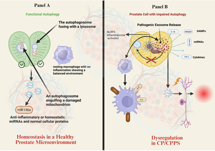 Autophagy dysfunction in prostate epithelial cells alters exosome-mediated intercellular communication. (A) Homeostasis: In a healthy prostate microenvironment, functional autophagy efficiently clears damaged organelles (e.g., mitochondria). Exosomes released under these conditions carry anti-inflammatory or homeostatic cargo (e.g., miR-146a), contributing to immune balance. (B) Dysregulation in CP/CPPS: Impaired autophagy (e.g., blocked autophagosome-lysosome fusion) leads to NLRP3 inflammasome activation and cellular stress. This results in the release of pathogenic exosomes enriched with pro-inflammatory cytokines (IL-1β, IL-6, TNF-α), damage-associated molecular patterns (DAMPs, HMGB1), and specific miRNAs. These exosomes propagate inflammation by activating immune cells (e.g., polarizing macrophages to an M1 phenotype) and contribute to neuronal sensitization, driving the pathophysiology of CP/CPPS. CP/CPPS: chronic prostatitis/chronic pelvic pain syndrome; NLRP3: NACHT, LRR and PYD domains-containing protein 3. Created in BioRender. Nyame, D. K. (2026) https://BioRender.com/iekaor6.