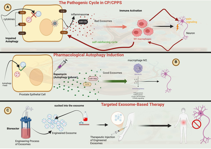 Strategic overview of therapeutic interventions targeting the autophagy-exosome axis in CP/CPPS. The schematic contrasts the self-reinforcing pathogenic cycle (left) with three potential therapeutic strategies (right, panels A–C). The pathogenic cycle: Impaired autophagy in prostate epithelial cells leads to the release of “bad” pro-inflammatory exosomes, which drive immune activation (M1 macrophage polarization), inflammasome signaling, cytokine release, and neuronal pain signaling. Therapeutic strategies: (A) Inhibition of pathogenic exosome release: Pharmacologically disrupting exosome biogenesis/secretion can break the cycle. (B) Pharmacological autophagy induction: Agents like rapamycin can restore autophagic flux, promoting the release of "good" exosomes with anti-inflammatory cargo (e.g., IL-10) that support an M2 macrophage phenotype. (C) Targeted exosome-based therapy: Engineered exosomes loaded with therapeutic cargo (e.g., anti-inflammatory cytokines, miRNA antagonists like anti-miR-155) can be produced ex vivo and injected to directly neutralize inflammatory signals in target cells (e.g., M1 macrophages) and block pain pathways. CP/CPPS: chronic prostatitis/chronic pelvic pain syndrome. Created in BioRender. Nyame, D. K. (2026) https://BioRender.com/e8u0f5o.