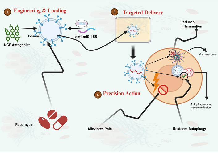 Mechanism of engineered exosomes as multifunctional therapeutics for CP/CPPS. (A) Engineering and loading: Exosomes are engineered in vitro to be loaded with a combination of therapeutic cargoes. This can include autophagy inducers (e.g., rapamycin), anti-inflammatory nucleic acids (e.g., anti-miR-155 antagonists), and pain pathway modulators [e.g., nerve growth factor (NGF) antagonists]. (B) Targeted delivery and anti-inflammatory action: Following administration, these multifunctional exosomes home to the inflamed prostate microenvironment. Upon fusion with target cells, they deliver their payload to suppress pro-inflammatory signaling (e.g., NLRP3 inflammasome) and reduce inflammation. (C) Restoration of autophagy and pain alleviation: The delivered cargo simultaneously restores autophagic flux (promoting autophagosome-lysosome fusion) and blocks pain sensitization pathways, thereby alleviating pain and addressing multiple facets of CP/CPPS pathology. CP/CPPS: chronic prostatitis/chronic pelvic pain syndrome; NLRP3: NACHT, LRR and PYD domains-containing protein 3. Created in BioRender. Nyame, D. K. (2026) https://BioRender.com/yh8pj1s.