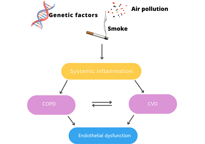 Exposure to harmful substances leads to the development of inflammatory mechanisms causing COPD and CVD. The two diseases are closely related and can lead to endothelial dysfunction. Figure was created with Canva
