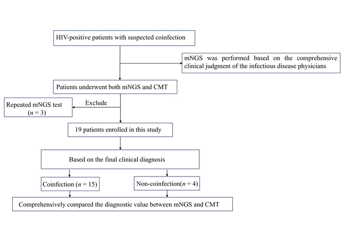 Conclusions: Compared with CMT, mNGS has a better detection rate. mNGS provides an alternative and promising method for identifying coinfections in HIV-positive patients. Thus, the combination of mNGS and CMT is a better diagnostic strategy for coinfections in HIV patients.