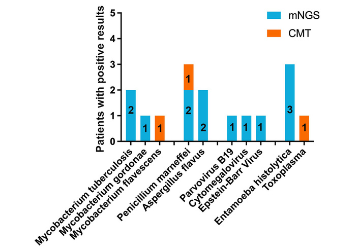 Using FCD as the standard, 16 strains from 10 types of pathogens were identified, including 3 types (4 strains, 25%) of bacteria, 2 types (5 strains, 31.3%) of fungi, 3 types (3 strains, 18.8%) of viruses, and 2 types (4 strains, 25%) of parasites. mNGS identified 8 types of pathogens, whereas CMT identified only 3 types. Both mNGS and CMT detected Penicillium marneffei (a fungus) in one patient. Seven types were detected only by mNGS: bacteria (Mycobacterium gordonae and Mycobacterium tuberculosis), fungi (Aspergillus flavus), viruses (Epstein-Barr virus, cytomegalovirus, parvovirus B19), and parasites (Entamoeba histolytica). A consistency assay for pathogen detection between mNGS and CMT is shown in Figure 2.